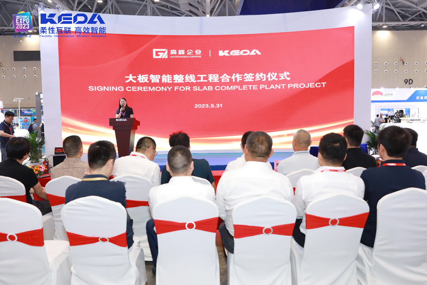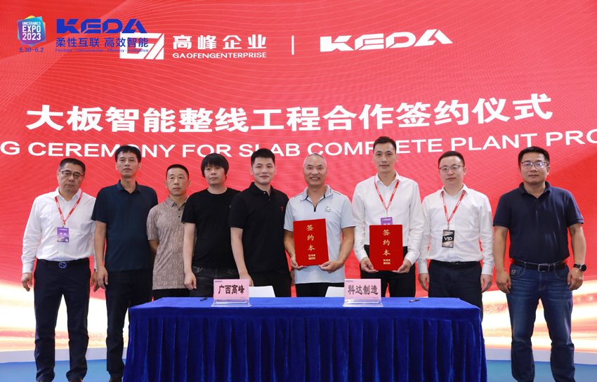 5月31日,人潮如鯽的科達展位上,在眾多與會觀眾的見證下,廣西高峰陶瓷有限公司與科達制造股份有限公司舉行了“大板智能整線工程合作簽約儀式”。