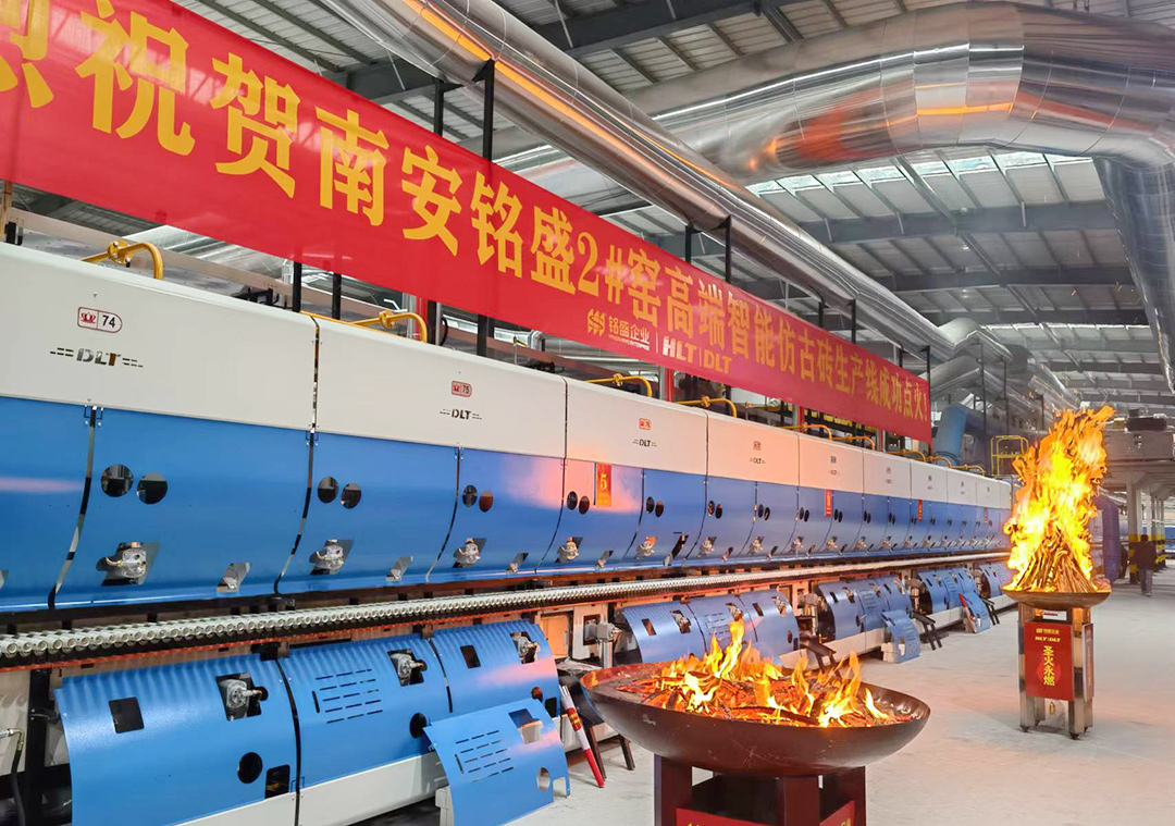 2號線引進(jìn)了力泰陶機(jī)13臺暢銷機(jī)型YP4009、“4.0能效標(biāo)桿數(shù)智時代”燒成窯和DHD-EM系列六層高效自循環(huán)干燥器組合。主要生產(chǎn)規(guī)格為400×800mm、800×800mm、750×1500mm,厚度7-10mm的高品質(zhì)仿古磚,設(shè)計日產(chǎn)能為17000m²。