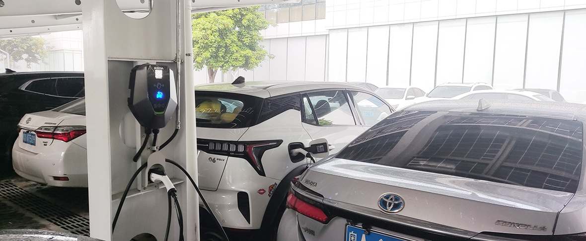 車棚占地面積約700平米,覆蓋52個(gè)標(biāo)準(zhǔn)停車位,安裝13個(gè)7KW充電樁,可滿足13輛車同時(shí)充電。