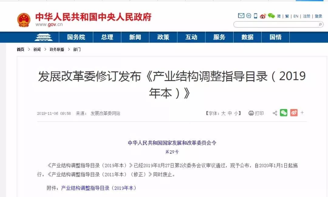 11月6日,發(fā)改委發(fā)布消息,《產(chǎn)業(yè)結(jié)構(gòu)調(diào)整指導(dǎo)目錄(2019年本)》于2019年8月27日第2次委務(wù)會議審議通過,自2020年1月1日起施行。《產(chǎn)業(yè)結(jié)構(gòu)調(diào)整指導(dǎo)目錄(2011年本)(修正)》同時廢止。