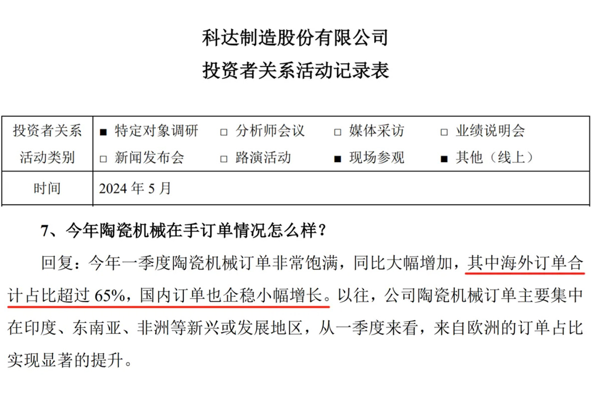 在全球化戰(zhàn)略的指導(dǎo)下,科達的陶機業(yè)務(wù)海外銷售比例于2024年再創(chuàng)新高。根據(jù)其發(fā)布的一系列公告內(nèi)容,陶機業(yè)務(wù)的海外市場接單占比在2022年首次突破55%,2023年繼續(xù)保持了該占比數(shù)據(jù),而在2024年一季度這一占比數(shù)據(jù)已沖破65%,國內(nèi)訂單也企穩(wěn)小幅增長。