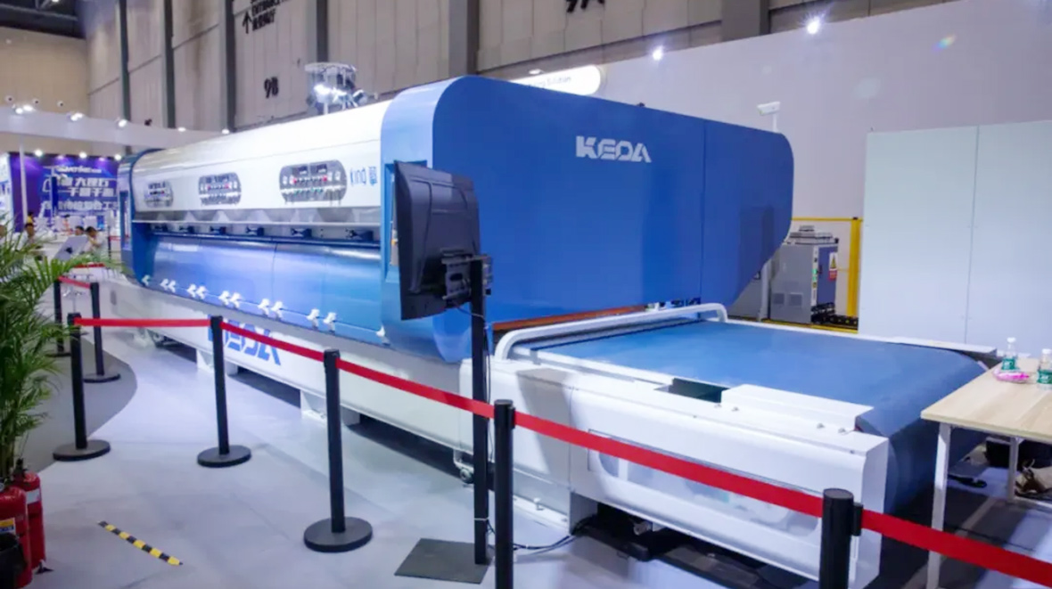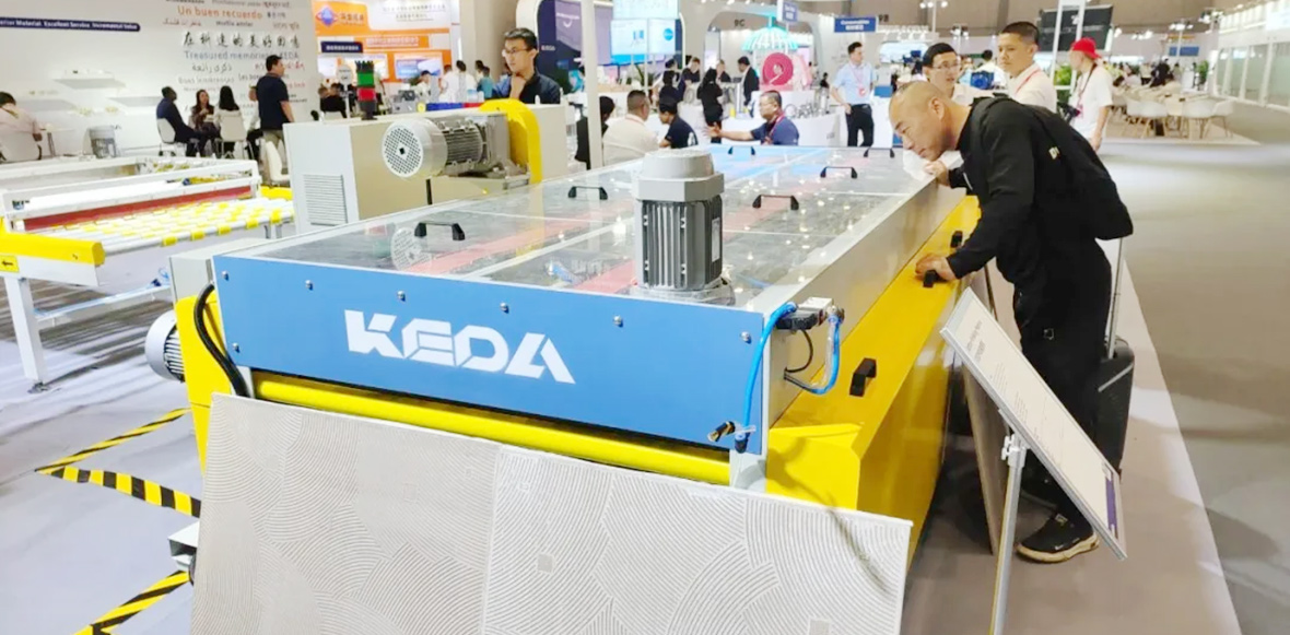 科達的新一代擎系列高效智能磨邊機,其工作寬度涵蓋150-3600mm,磚坯加工厚度從3mm到40mm;推磚速度超過了100片/分鐘,對角線誤差≤0.3mm(以400×800mm為例);還應(yīng)用了集成磨削量測量、AI算法技術(shù)及直驅(qū)節(jié)電技術(shù),使得磨邊精度高,產(chǎn)品優(yōu)等率達99.7%以上。