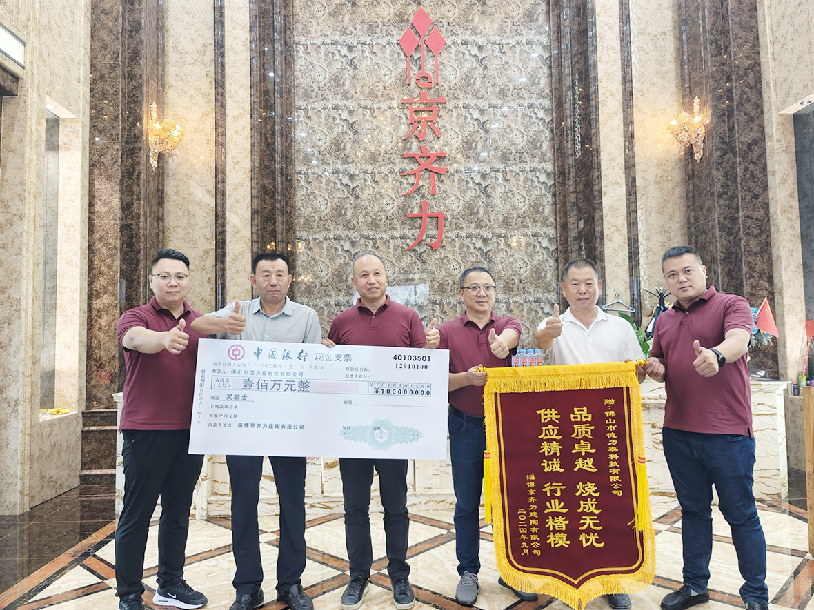 正是由于這條生產(chǎn)線在節(jié)能增效方面的突出表現(xiàn),近日,京齊力陶瓷向力泰陶機(jī)贈(zèng)送了錦旗以及節(jié)能達(dá)標(biāo)后的100萬元獎(jiǎng)勵(lì),表達(dá)了其對(duì)力泰陶機(jī)智能整線的高度認(rèn)可,信守承諾的京齊力陶瓷也因此贏得了廣大供應(yīng)商的信賴。