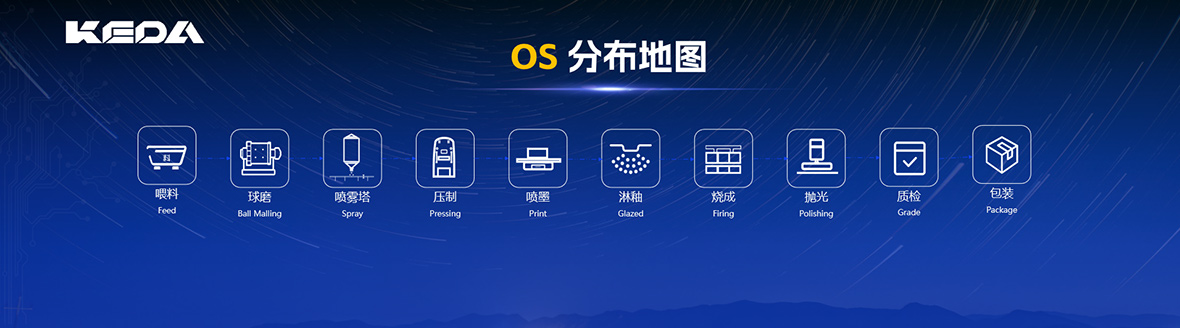首先,科達OS操作系統(tǒng)可實現(xiàn)全流程覆蓋??膳鋫溆谖沽蠙C、球磨機、噴霧塔、壓機、噴墨機、淋釉機、窯爐、拋光機、磨邊機、質(zhì)檢機、包裝機等陶瓷生產(chǎn)全流程的每一臺關(guān)鍵單機設(shè)備,讓每一臺機器都完成數(shù)字化。