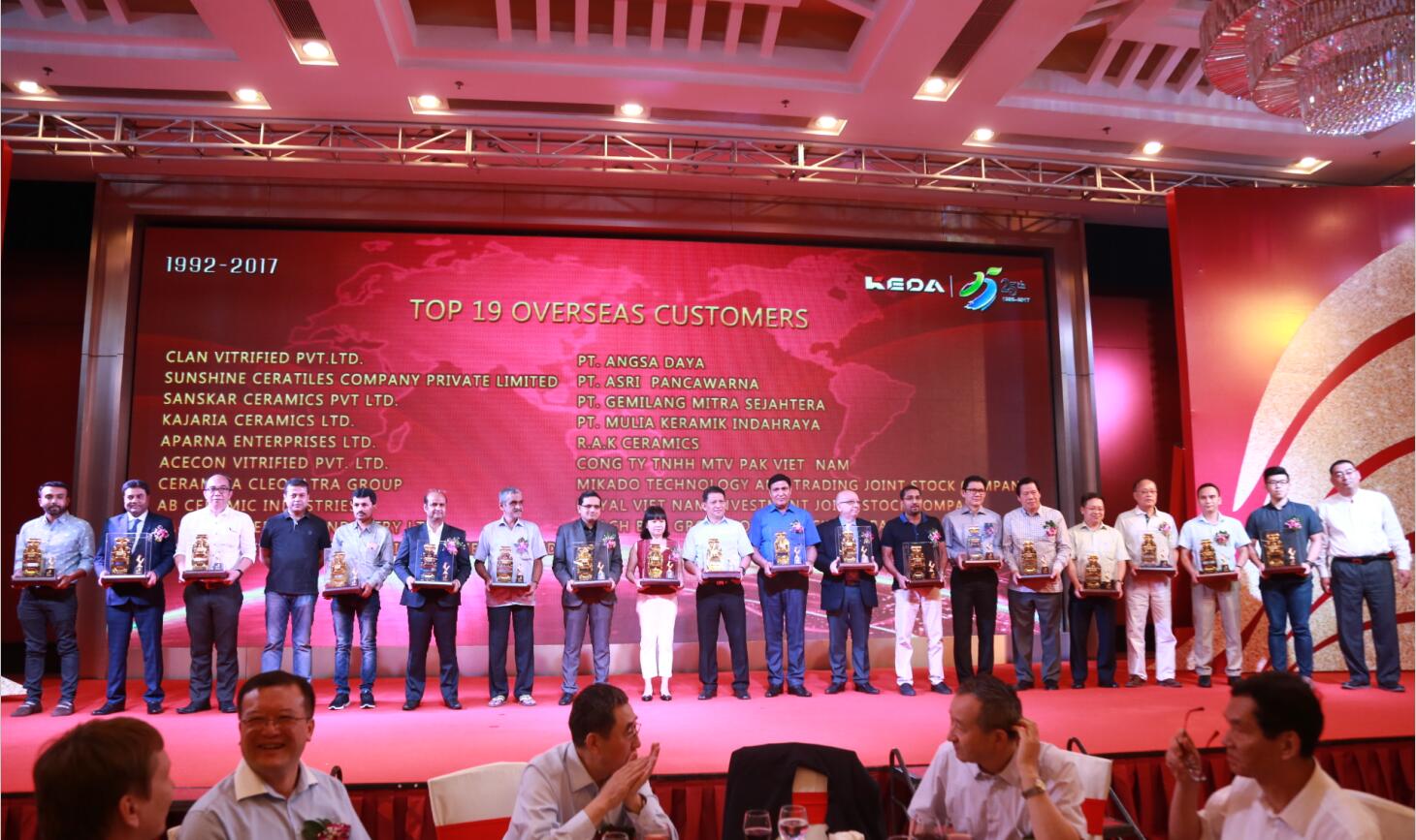 6月1日晚,佛山皇冠假日酒店四樓萬豪廳大廳內(nèi)外擺滿了酒席,“創(chuàng)新為了您——2017科達全球客戶答謝晚宴”在此隆重舉行。中國輕工業(yè)聯(lián)合會副會長兼中國陶瓷工業(yè)協(xié)會理事長杜同和、中國建筑材料聯(lián)合會副會長兼中國建筑衛(wèi)生陶瓷協(xié)會會長葉向陽、中國國際貿(mào)易促進委員會建筑材料行業(yè)分會副會長王耀和周治洲、中國陶瓷工業(yè)協(xié)會秘書長侯文全及副秘書長樊瑞新、中國建筑衛(wèi)生陶瓷協(xié)會副秘書長尹虹、中國建筑衛(wèi)生陶瓷協(xié)會副秘書長宮衛(wèi)、中國陶瓷工業(yè)協(xié)會建筑衛(wèi)生陶瓷專業(yè)委員會秘書長黃芯紅、廣東省建筑材料行業(yè)協(xié)會創(chuàng)會會長吳一岳、廣東陶瓷協(xié)會會長陳環(huán)和秘書長陳振廣、佛山市陶瓷行業(yè)協(xié)會秘書長羅青、佛山市建材行業(yè)協(xié)會秘書長孔海發(fā)以及媒體代表、國內(nèi)外客戶1500余人出席盛會。今年晚宴的分主題為“科達制式利全球 一帶一路齊共享”,以科達為代表的中國制式正惠及全球越來越多的國家,科達愿與客戶及合作伙伴一道共享一帶一路的碩果。