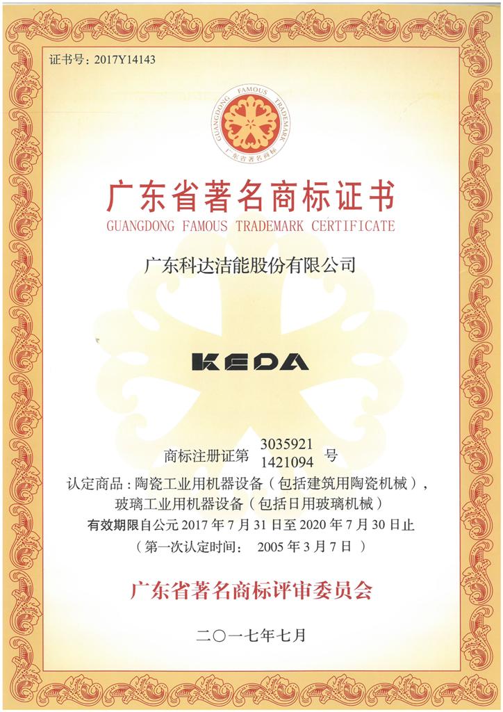 7月31日,廣東省著名商標(biāo)評(píng)審委員會(huì)發(fā)布了《2016年度廣東省著名商標(biāo)認(rèn)定和延續(xù)公告》,近日,科達(dá)潔能收到廣東著名商標(biāo)證書(shū)相關(guān)文件, “KEDA”品牌商標(biāo)成功獲得延續(xù)認(rèn)定,有效期限自2017年7月31日至2020年7月30日止。