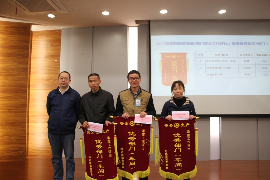 2017年第四季度安全生產(chǎn)優(yōu)秀部門(車間):生產(chǎn)供應(yīng)中心金工一車間、研發(fā)院數(shù)碼打印機(jī)械裝配車間、成型壓機(jī)車間(獎(jiǎng)金:1000元/單位),生產(chǎn)供應(yīng)中心總經(jīng)理毛清為獲獎(jiǎng)單位頒獎(jiǎng)。