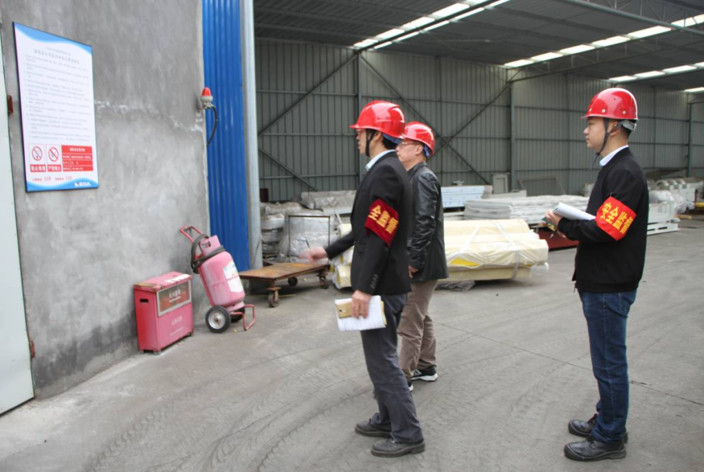 周總率安檢人員進(jìn)車間、查倉庫、入廚房,先后仔細(xì)檢查了石材車間、深加工車間、結(jié)構(gòu)件車間、光伏電站控制室、物管部油漆倉庫、整線工程油漆倉庫、生產(chǎn)垃圾池及公司飯?zhí)煤髲N等重點區(qū)域。檢查人員對現(xiàn)場檢查中發(fā)現(xiàn)的消防、電氣、設(shè)備防護(hù)等隱患一一登記,周總還在現(xiàn)場對安全隱患提出了具體整改提出了要求和指導(dǎo)意見。
