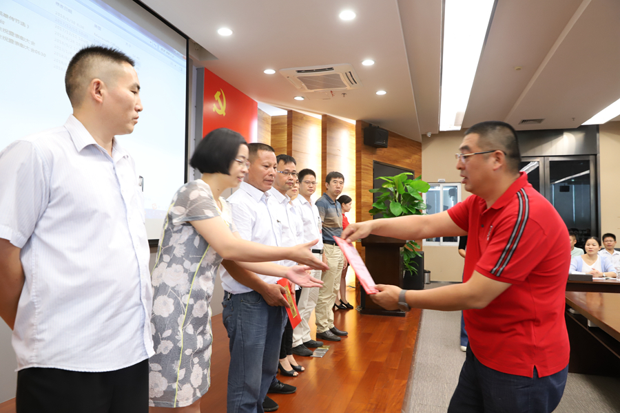 隨后,黨委副書記、人力資源總監(jiān)蘇順兵宣讀了關(guān)于《表彰2018年度優(yōu)秀共產(chǎn)黨員、優(yōu)秀黨務(wù)工作者的決定》文件。優(yōu)秀黨員代表、整線工程生產(chǎn)管理部經(jīng)理助理張曉群上臺(tái)分享了自己的思想感悟。廣東總部基地七位新加入的黨員在全體黨員的見證下,舉行了莊嚴(yán)的宣誓。邊董也為獲得優(yōu)秀黨員、優(yōu)秀黨務(wù)工作者的黨員同志頒發(fā)了榮譽(yù)證書。
