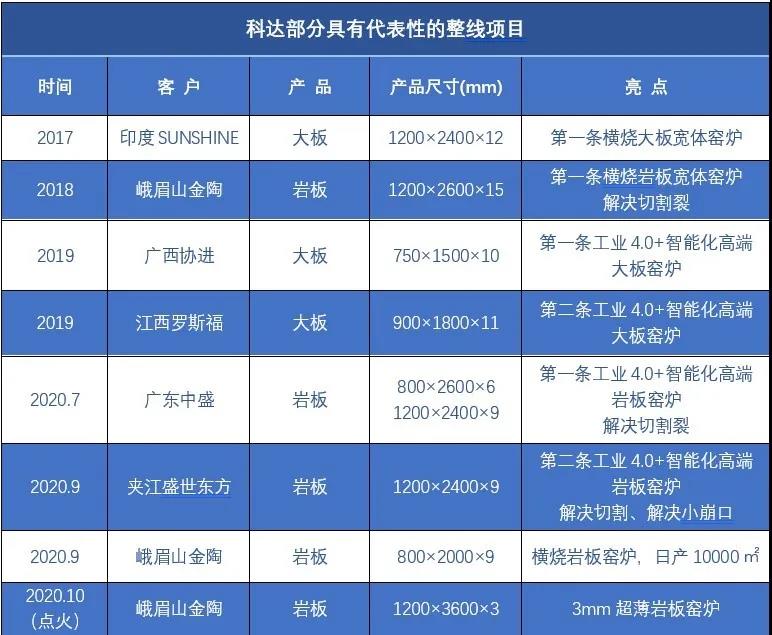 從今年10月份到明年上半年,科達(dá)承建的峨眉山金陶瓷業(yè)3mm超薄巖板窯爐以及夾江華興、江西金利源、湖南亞泰、高安羅斯福、漳州建華、臨沂大將軍、肇慶將軍等10條大板中板巖板整線項目將陸續(xù)投產(chǎn)。