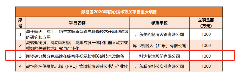 科達(dá)制造股份有限公司與佛山喀視科技有限公司、廣東工業(yè)大學(xué)、佛山科學(xué)技術(shù)學(xué)院、季華實(shí)驗(yàn)室、華南理工大學(xué)等企業(yè)及高校院所共同承擔(dān)的項(xiàng)目“陶瓷磚分級(jí)分色高速在線智能視覺檢測關(guān)鍵技術(shù)及裝備”作為順德區(qū)2020年核心技術(shù)攻關(guān)重大項(xiàng)目之一,獲得了1000萬立項(xiàng)資金支持??七_(dá)制造副總裁周鵬代表公司上臺(tái)接受佛山市委副書記、順德區(qū)委書記郭文海頒發(fā)的項(xiàng)目資助支票。
