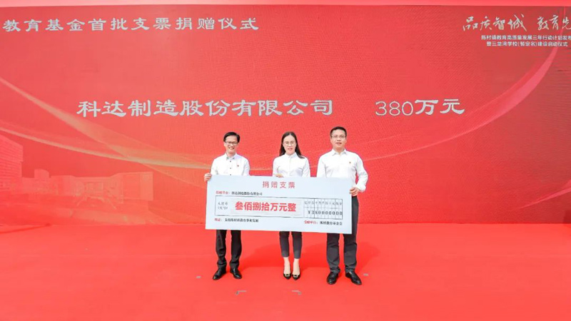 科達制造作為熱心公益事業(yè)、心系陳村教育的企業(yè),當(dāng)天由公司總裁辦主任饒瓊代表公司捐贈380萬元以支持陳村鎮(zhèn)教育事業(yè)的發(fā)展。