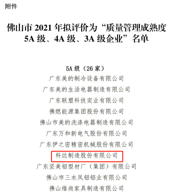 近日,佛山市市場(chǎng)監(jiān)督管理局2021年企業(yè)質(zhì)量管理成熟度評(píng)價(jià)結(jié)果已通過(guò)公示,科達(dá)制造及恒力泰位列其中,獲評(píng)“佛山市2021年企業(yè)管理成熟度5A級(jí)企業(yè)”。