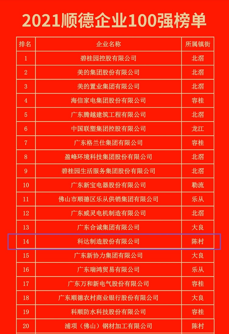 12月28日上午,由廣東省企業(yè)聯(lián)合會(huì)、廣東省企業(yè)家協(xié)會(huì)、順德區(qū)工商聯(lián)、順德區(qū)經(jīng)促局指導(dǎo),順德區(qū)企業(yè)聯(lián)合會(huì)、順德區(qū)企業(yè)家協(xié)會(huì)主辦的“品質(zhì)順德 再攀高峰——2021順德企業(yè)100強(qiáng)新聞發(fā)布會(huì)”在佛山市順德華桂園隆重舉行。會(huì)上,發(fā)布了2021順德企業(yè)100強(qiáng)榜單。這是順德區(qū)首次發(fā)布順德企業(yè)100強(qiáng)榜單,也是廣東省首個(gè)區(qū)一級(jí)發(fā)布的百?gòu)?qiáng)企業(yè)榜單。其中,科達(dá)制造作為順德區(qū)裝備制造業(yè)的代表榮列其中,位居榜單第14位。
