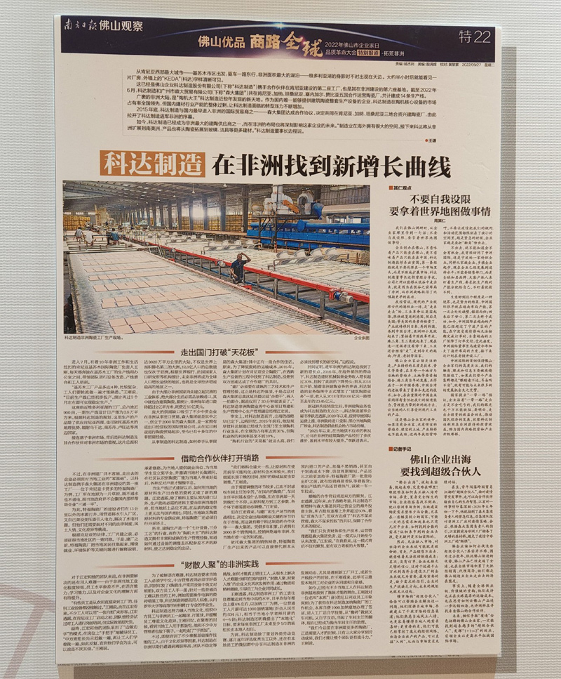 科達(dá)這幾年在非洲的開(kāi)拓布局,除了自身獲得收益之外,也為當(dāng)?shù)貛?lái)了很多積極的影響:首先是科達(dá)目前在非洲的五個(gè)國(guó)家布局的六個(gè)生產(chǎn)基地,雇用了超過(guò)7000名本地人,一定程度上解決了當(dāng)?shù)氐木蜆I(yè);其次是由于瓷磚實(shí)現(xiàn)了本地生產(chǎn),解決了當(dāng)?shù)匾酝蛸?gòu)買(mǎi)進(jìn)口瓷磚而導(dǎo)致的外匯流失;三是大大改善了當(dāng)?shù)厝说纳?,他舉例進(jìn)行對(duì)比:中國(guó)在上世紀(jì)80年代初期引入第一條進(jìn)口瓷磚生產(chǎn)線,當(dāng)時(shí)一個(gè)工人一年的收入只能買(mǎi)2平方米的瓷磚,現(xiàn)在一個(gè)科達(dá)的非洲工人,一個(gè)月的工資就可以買(mǎi)30多平方米的瓷磚,科達(dá)用實(shí)際行動(dòng)踐行了“有家就有佛山造”的理念,為非洲帶來(lái)居住環(huán)境的切實(shí)改善。邊董也在現(xiàn)場(chǎng)為非洲進(jìn)行“正名”,非洲并不是一個(gè)又臟又懶又暴力的國(guó)度,大家可以親自去當(dāng)?shù)乜纯?,消除疑慮、破除謠言。邊董最后表示,科達(dá)未來(lái)更大的發(fā)展空間肯定是在國(guó)外,陶瓷機(jī)械也是得益于多年在海外的精耕細(xì)作,今年上半年實(shí)現(xiàn)了外銷(xiāo)大于內(nèi)銷(xiāo)的良好局面,很好地對(duì)沖了國(guó)內(nèi)市場(chǎng)下滑的缺口。