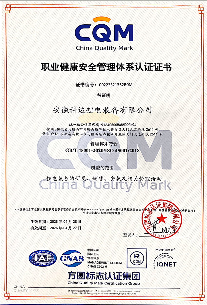 5月初,安徽科達鋰電裝備有限公司順利通過ISO9001質(zhì)量管理體系、ISO14001環(huán)境管理體系、ISO45001職業(yè)健康安全管理體系認證。