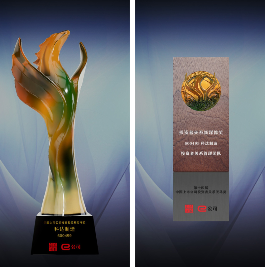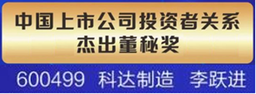 科達(dá)制造憑借在投資者關(guān)系工作中的優(yōu)異表現(xiàn)在評選中脫穎而出,榮獲“中國上市公司投資者關(guān)系天馬獎”、“中國上市公司投資者關(guān)系新媒體獎”兩項大獎,公司副總裁、董事會秘書李躍進(jìn)先生榮獲“中國上市公司投資者關(guān)系杰出董秘獎”。
