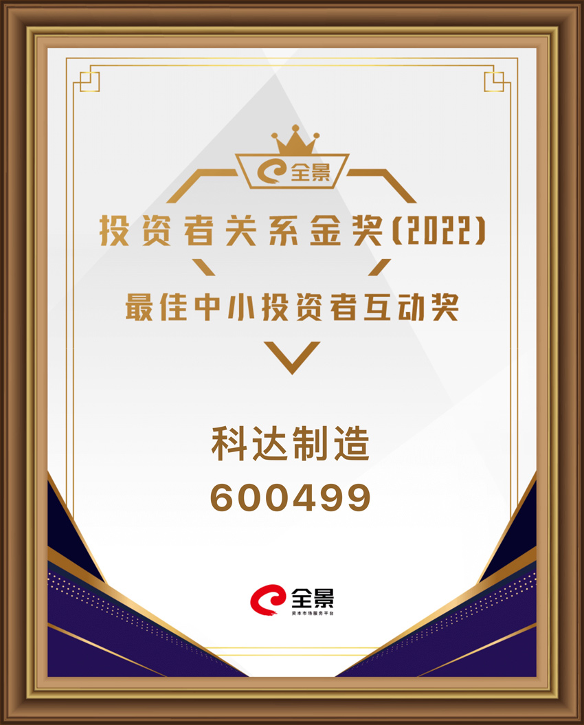 5月23日,由深圳市全景網(wǎng)絡(luò)有限公司主辦、南開大學(xué)中國公司治理研究院參與推出的“全景投資者關(guān)系金獎”2022年度全國性評選的獲獎榜單正式揭曉。自2019年起,全景網(wǎng)開始聯(lián)合專業(yè)學(xué)術(shù)科研機(jī)構(gòu)——南開大學(xué)中國公司治理研究院投資者關(guān)系管理研究團(tuán)隊,推出“全景投資者關(guān)系金獎”。該獎項秉承獨立、客觀、公正的原則,采用南開大學(xué)“投資者關(guān)系互動溝通”量化評價體系,評選出在投資者關(guān)系工作中表現(xiàn)優(yōu)異的上市公司、個人和組織。科達(dá)制造憑借與中小投資者良好的互動交流,榮獲“最佳中小投資者互動獎”獎項。