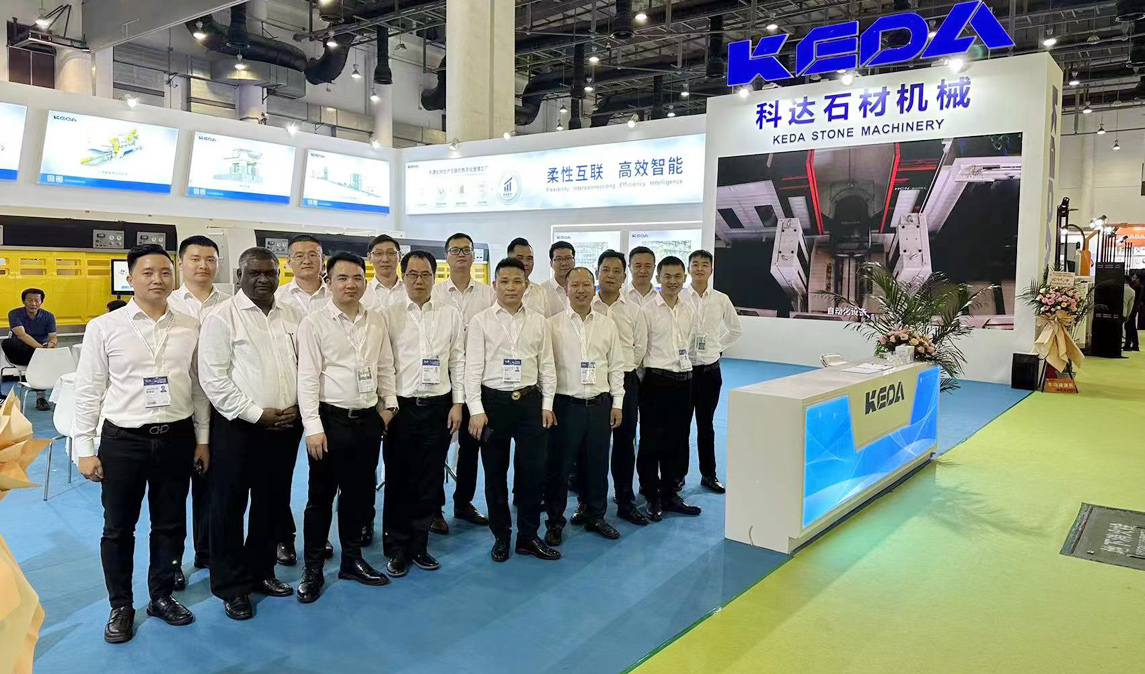 ▲科達(dá)石材機(jī)械印度本土服務(wù)團(tuán)隊(duì)負(fù)責(zé)人Sridhar(前排左二)在廈門石材展科達(dá)石材機(jī)械展位