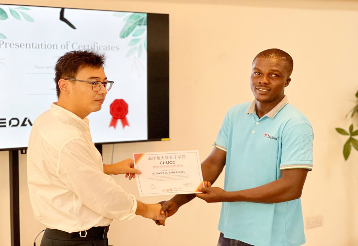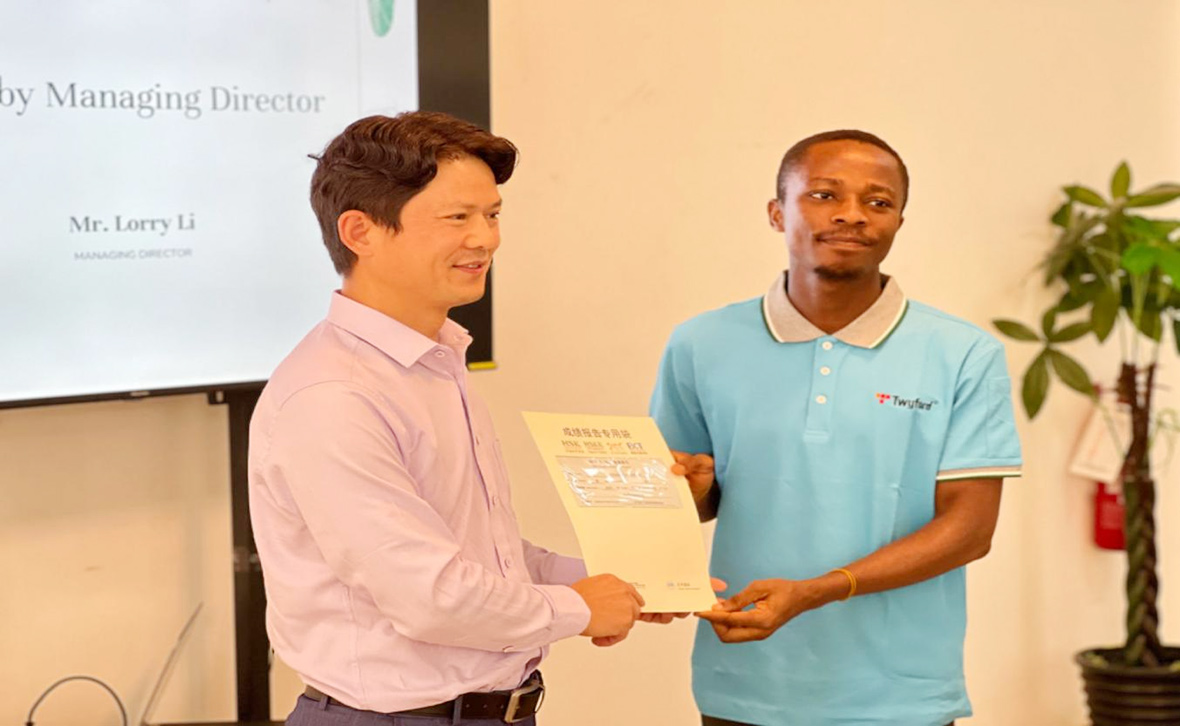 在典禮上,OFORI院長和李偉總經(jīng)理為四名優(yōu)秀中文學(xué)員頒發(fā)了大使獎學(xué)金、優(yōu)秀學(xué)員獎杯和證書,每位學(xué)員還獲得了100美元的大使獎學(xué)金。同時,賈老師為所有學(xué)員頒發(fā)了結(jié)業(yè)證書,并為參加漢語等級考試的七名學(xué)員頒發(fā)了考試成績單。加陶人力資源部也宣布為這七名學(xué)員進行了薪資調(diào)整,以表彰他們在漢語學(xué)習(xí)和中加文化交流中做出的貢獻。每個獲獎的學(xué)員心情充滿了喜悅與感激,先后用自己學(xué)到的中文來表達自己的感謝,其中一名優(yōu)秀學(xué)員Anthony還用中文發(fā)表了一段獲獎感言,表達了對公司提供寶貴的工作和漢語培訓(xùn)機會的感激之情,并表示自己將會在日后的工作生活中更多地去實踐漢語,多用中文交流,并把自己學(xué)習(xí)漢語的經(jīng)驗傳授給其他想要學(xué)習(xí)中文的當(dāng)?shù)赝聜儭?br />