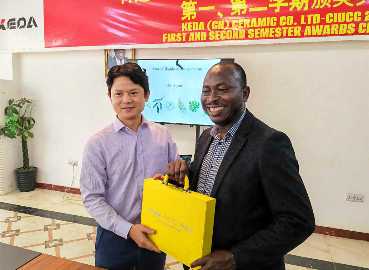 最后,為感謝孔子學(xué)院一直以來對科達(加納)陶瓷廠本地員工學(xué)習(xí)漢語的支持和幫助,科達(加納)陶瓷廠向OFORI院長贈送了具有中國文化特色的科達陶瓷餐具,代表了中加的文化融合與交流,也代表了雙方的合作與友誼。