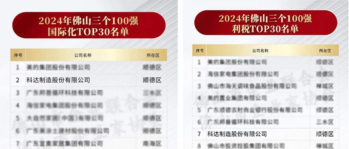 科達(dá)制造憑借車越的綜合實(shí)力再度入圍佛山企業(yè)“利稅TOP30”與“國際化TOP30”榮譽(yù)榜單,分列“利稅TOP30”榜第7名及“國際化TOP30”榜第2名。值得一提的是,相較去年科達(dá)制造在榜單上的排名區(qū)逐年攀升,且在“國際化”榜單中榮登第2位。