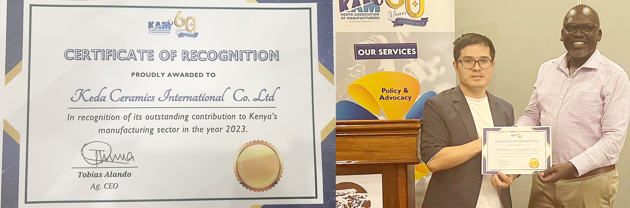 會上對卓越制造商進(jìn)行了表彰,特福(肯尼亞)潔具榮獲肯尼亞“年度最佳制造商”稱號。此外,特福(肯尼亞)陶瓷總經(jīng)理李瑞欽當(dāng)選為肯尼亞制造商協(xié)會董事,成為商協(xié)會自1959年成立65年以來的首位華人董事。