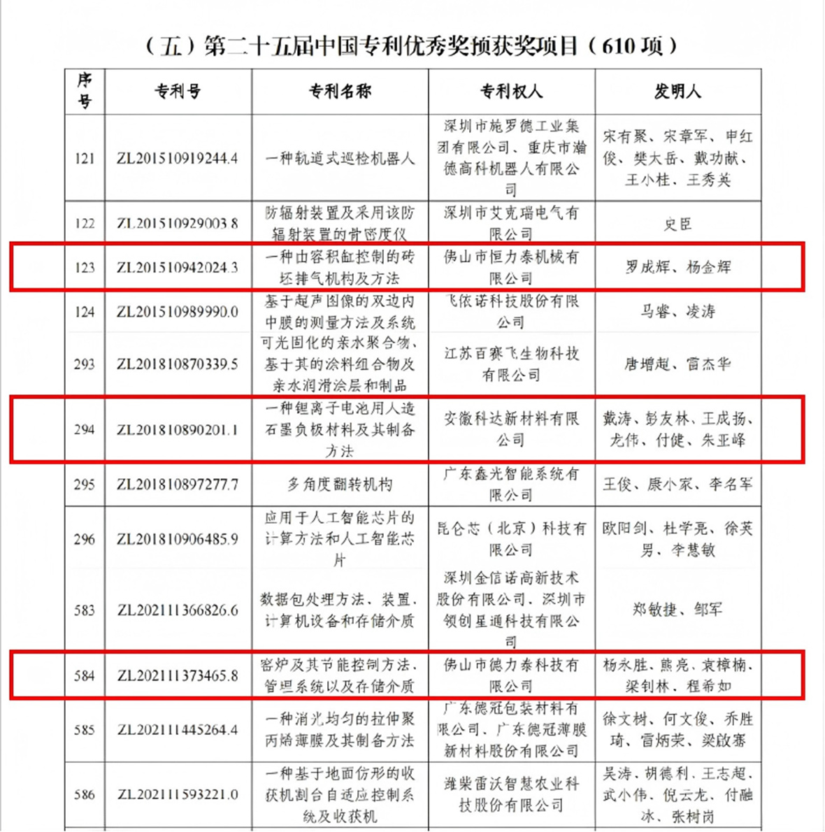 其中,子公司恒力泰“一種由容積缸控制的磚坯排氣機(jī)構(gòu)及方法”項(xiàng)目、安徽科達(dá)新材料“一種鋰離子電池用人造石墨負(fù)極材料及其制備方法”項(xiàng)目、德力泰“窯爐及其節(jié)能控制方法、管理系統(tǒng)以及存儲介質(zhì)”項(xiàng)目分獲中國專利優(yōu)秀獎。