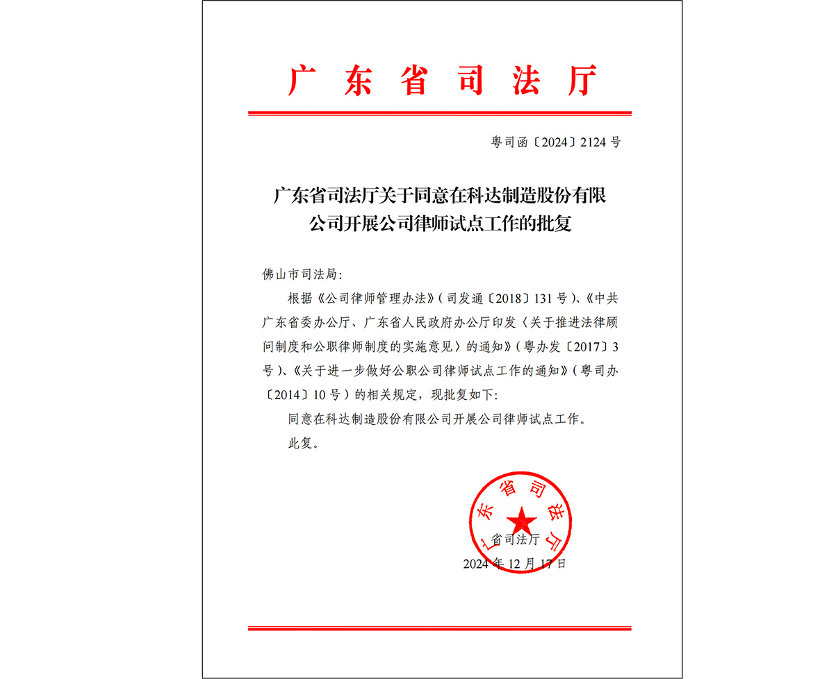 2024年底,科達(dá)制造股份有限公司成功獲得廣東省司法廳“公司律師試點(diǎn)工作”批復(fù),成為順德區(qū)第四家獲此資質(zhì)的民營企業(yè)(前三家分別為美的集團(tuán)、美的置業(yè)及順德農(nóng)商銀行)。