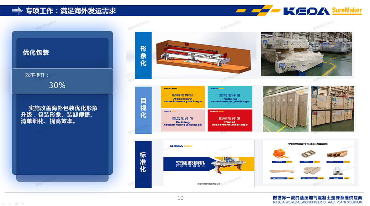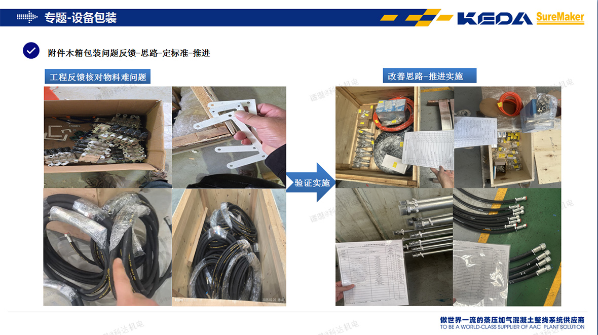 在全球化的浪潮中,海外設(shè)備的發(fā)運(yùn)不僅涉及物流環(huán)節(jié),更是客戶體驗(yàn)與品牌信譽(yù)的關(guān)鍵戰(zhàn)場(chǎng)。為精準(zhǔn)滿足客戶的需求,安徽科達(dá)機(jī)電不斷提升這一關(guān)鍵環(huán)節(jié)的服務(wù)品質(zhì)。為此,在2024年9月,安徽科達(dá)機(jī)電工程供應(yīng)中心成立了“海外打包專項(xiàng)組”,通過(guò)在包裝材料、工藝等方面加大投入,定向?qū)嵤└纳坪M獯虬ぷ鞯纳?jí)優(yōu)化,系統(tǒng)性地提高海外打包效率、產(chǎn)品包裝質(zhì)量、裝卸貨方式、裝運(yùn)清單細(xì)化、外觀標(biāo)識(shí)等多個(gè)方面,全面提升海外產(chǎn)品打包發(fā)運(yùn)質(zhì)量的保障。