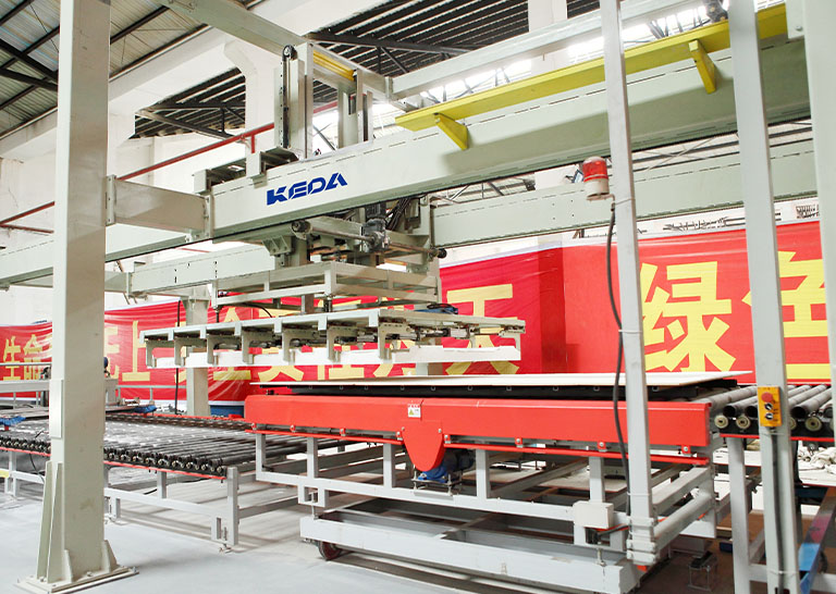 獨(dú)特的卸板機(jī)巧妙地將窯尾自動(dòng)拆圍板和卸板融為一體:拆圍板機(jī)械手將圍板整體拆除后,窯具載著產(chǎn)品到卸板機(jī)械手下方,機(jī)械手下降夾住產(chǎn)品兩側(cè)并提升前移,將產(chǎn)品放入送板輥臺(tái)。同時(shí)拆圍板機(jī)械手將圍板放入空棚板上。