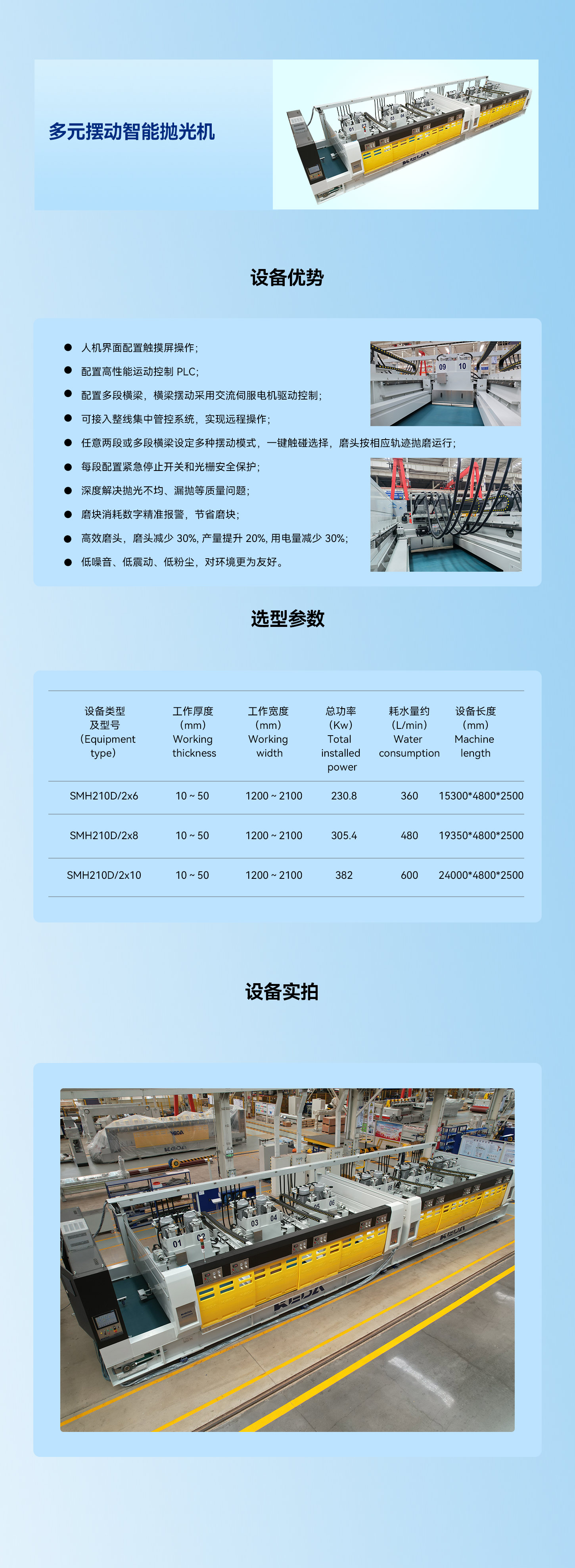 配置多段擺動(dòng)拋光頭,通過人機(jī)界面根據(jù)磨具排號選擇橫梁擺動(dòng)方式,采用順序擺,一字?jǐn)[,交叉擺等多段擺動(dòng)方式,能夠有效解決高端石材拋光過程中拋光不均、漏拋等質(zhì)量問題,實(shí)現(xiàn)拋光面的高效覆蓋。